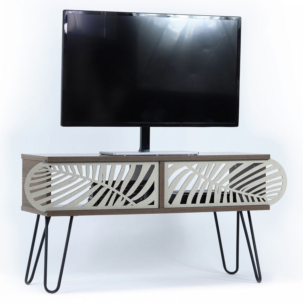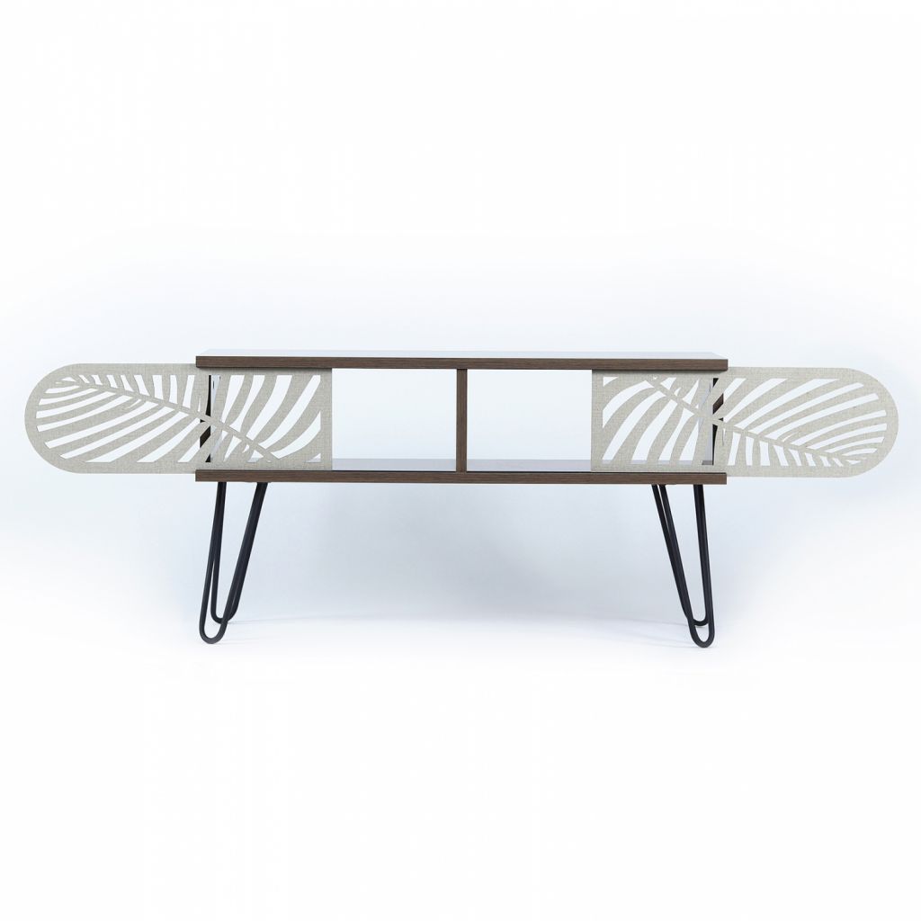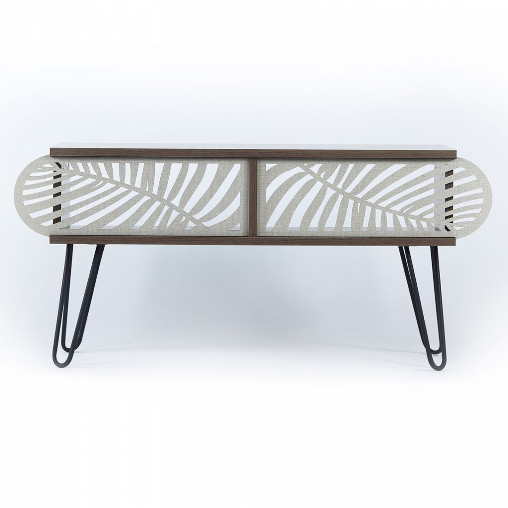 Έπιπλο τηλεόρασης με συρόμενα πορτάκια σε καρυδί απόχρωση με λεπτομέρειες σε εκρού και μαύρο χρώμα.Κατασκευασμένο από μελαμίνη υψηλών προδιαγραφών με μεταλλικά πόδια σε λευκή απόχρωση.