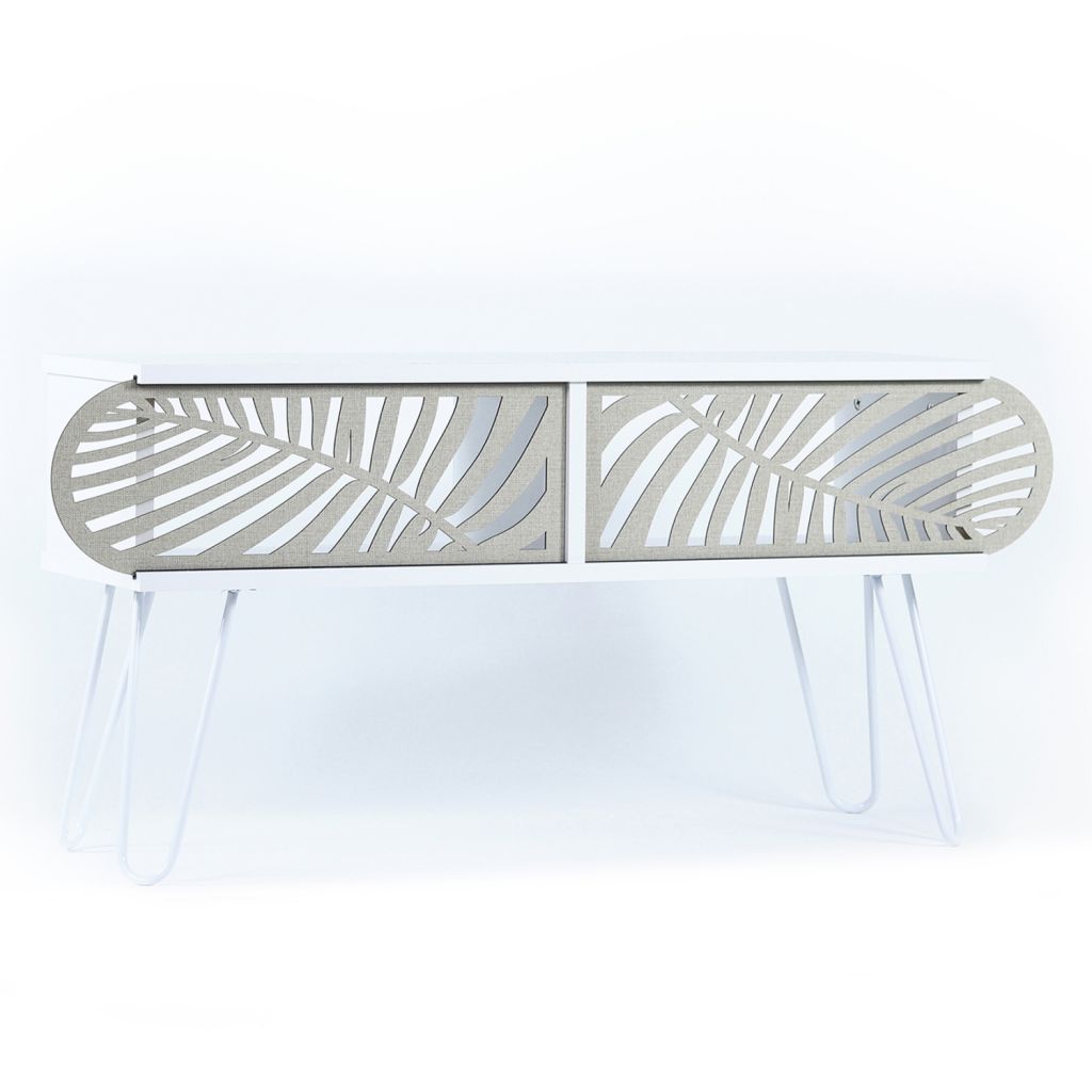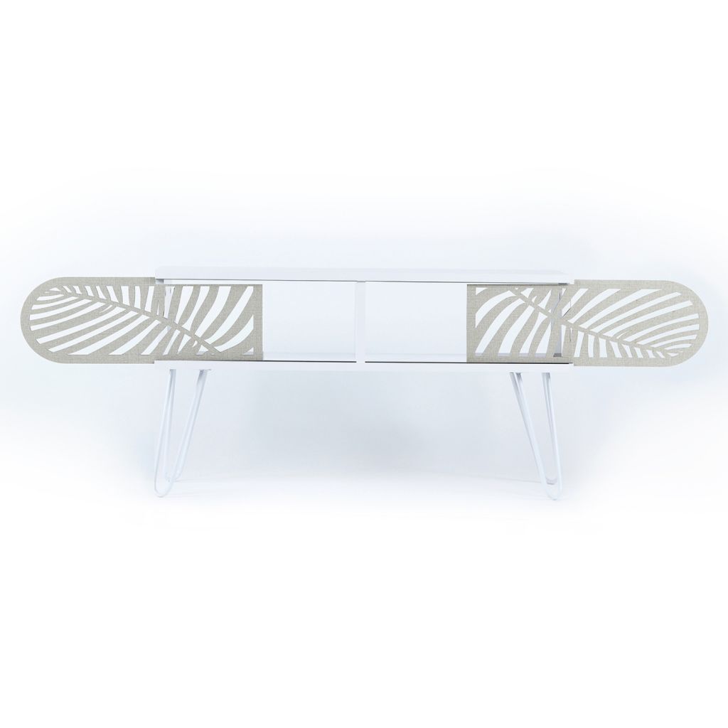 Έπιπλο τηλεόρασης με συρόμενα πορτάκια σε λευκή απόχρωση με λεπτομέρειες σε εκρού χρώμα.Κατασκευασμένο από μελαμίνη υψηλών προδιαγραφών με μεταλλικά πόδια σε λευκή απόχρωση.