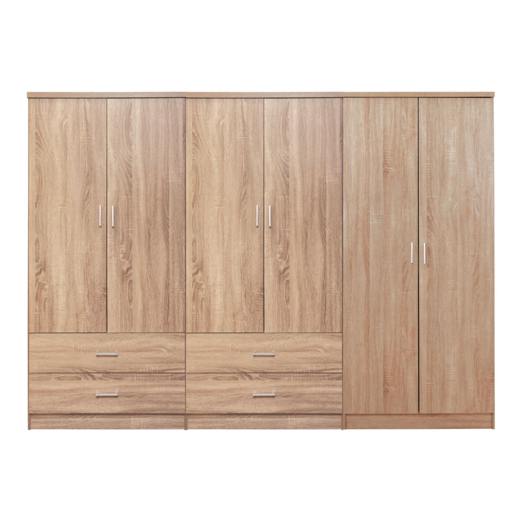 Γνωρίστε άλλη μία εκδοχή της ντουλάπας-γκαρνταρόμπας REINA. Πρόκειται για μια μεγάλη ντουλάπα με 6 πόρτες, χωρισμένη σε δύο μέρη. Η μία πλευρά διαθέτει μπάρα για κρέμαση ρούχων και 4 συρτάρια στο κάτω μέρος. Η άλλη πλευρά διαθέτει επίσης μπάρα για κρέμαση ρούχων και ένα ράφι πάνω από την μπάρα. Οι πόρτες αλλά και τα συρτάρια ανοίγουν με καλαίσθητα ασημί χερούλια. Είναι κατασκευασμένη από μελαμίνη σε SONAMA χρώμα και αισθητικά μπορεί να ταιριάξει με πολλά άλλα στυλ, χάρη και στις «καθαρές» γραμμές της.ΔΙΑΣΤΑΣΕΙΣ: