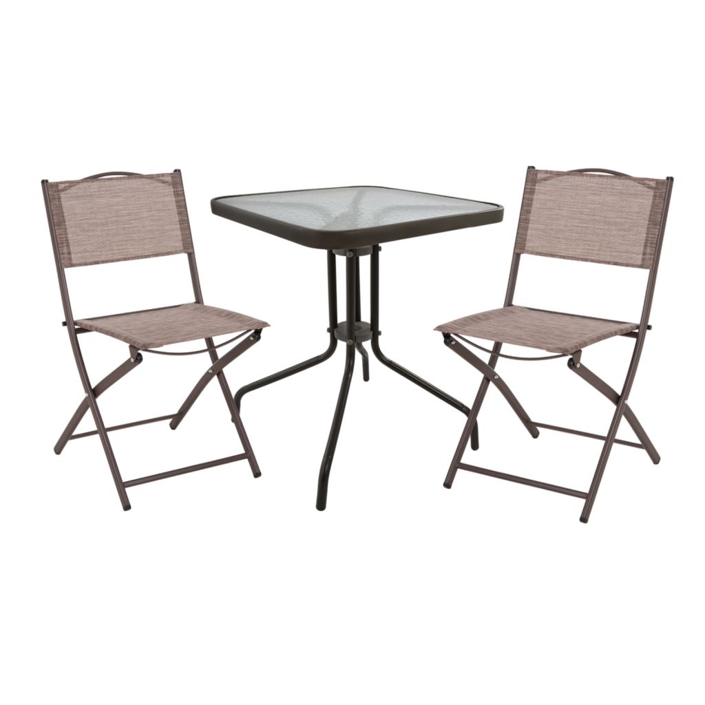 Σετ εξωτερικού χώρου με τετράγωνο τραπέζι με ΚΑΦΕ μεταλλικό σκελετό και γυάλινη θολή ΕΝΙΣΧΥΜΕΝΗ επιφάνεια και 2 μεταλλικές πτυσσόμενες καρέκλες με textilene, σε ΚΑΦΕ χρώμα.Ιδανικό σετ για μικρούς χώρους, όπως μπαλκόνια, φοιτητικά σπίτια κτλ.